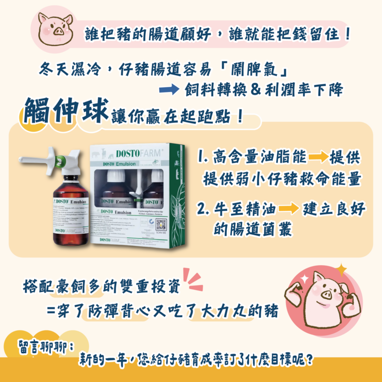 特別是這幾天濕濕冷冷,最容易讓仔豬腸道「鬧脾氣」。只要腸道一弱,飼料轉換率就往下掉,利潤也跟著溜滑梯。想贏在起跑點?試試 觸伸球 吧!