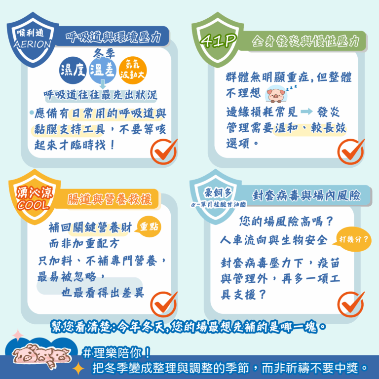 •冬天溫差、濕度與氨氣波動大時,呼吸道往往是最先出狀況的地方,對豬和禽都一樣。