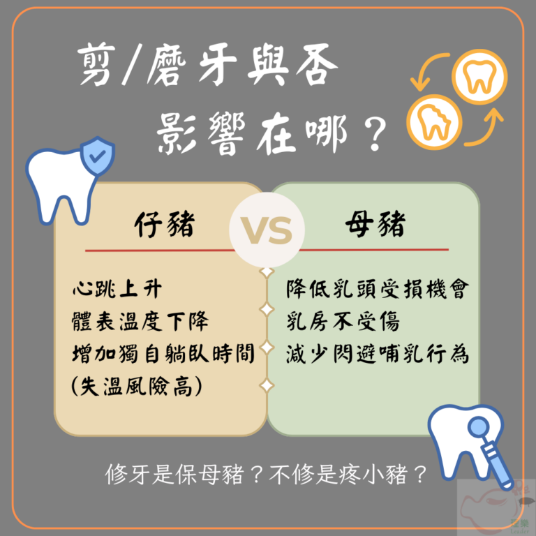 修牙的好處主要集中在哺乳初期,但也伴隨風險─仔豬修牙後常出現心跳上升、體表溫度下降、獨自躺臥與不玩耍等行為,可能導致失溫與營養攝取不足。