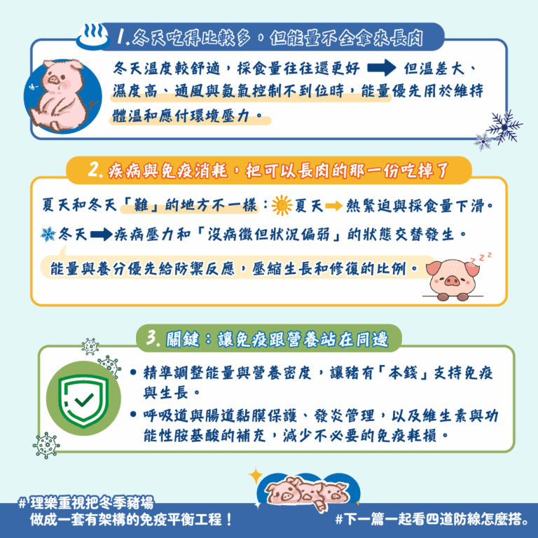 如果冬天只是讓豬吃得比較多,但沒有同步照顧好呼吸道與腸道黏膜、發炎狀態和病中病後的營養補回來,結果就會變成:一邊拚命加料、一邊免疫系統在後面把能量花掉,長期看起來就像是在體內拔河。