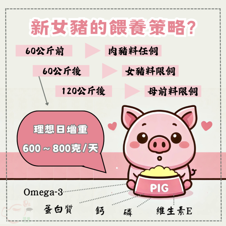 新女豬的餵養策略在 60 公斤以前,新女豬的營養需求與肉豬相似,可採用任飼餵養。當體重達60 公斤後,應調整為女豬料並進行限飼,以控制日增重 600~800 克/天,確保骨骼與生殖系統穩定發育。當新女豬體重達 120 公斤,應更換為母前料並持續限飼,保持適當體況,避免過度增重。生長過快可能導致脂肪累積過多,若背脂厚度超過 18mm,可能影響發情規律並降低受胎率。營養上應提供足夠的蛋白質、礦物質(鈣、磷)、維生素 E 及 Omega-3,促進生殖系統發育,保證繁殖能力與未來的泌乳品質。