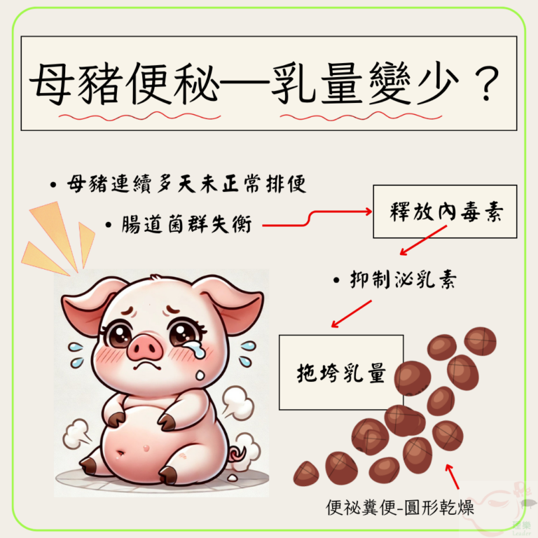 母豬便秘—乳量變少?母豬在懷孕後期與哺乳期常出現便秘問題,尤其肥胖母豬更容易中標。當連續多天未正常排便時,腸道菌群會失衡,大腸桿菌等壞菌快速增殖並釋放內毒素。這些毒素進入血液後,會干擾母豬代謝,抑制泌乳素與甲狀腺素的分泌,並讓腎上腺皮質醇升高,進一步阻礙泌乳。便秘看似小事,卻可能拖垮乳量!想讓小豬吃得飽、長得壯,從母豬的「排便順暢」開始!