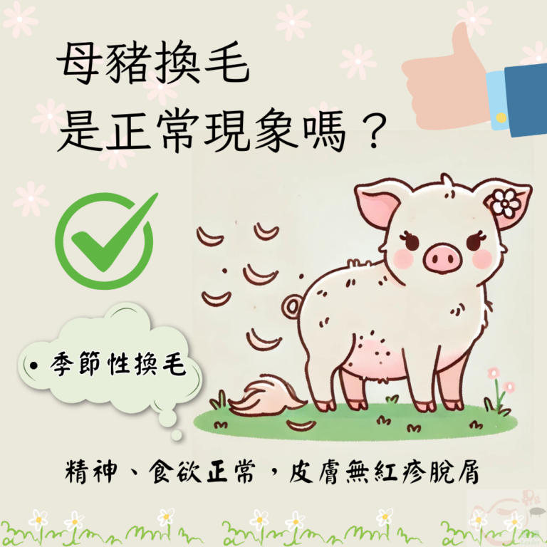 母豬換毛是正常現象嗎?春秋交替時,母豬會出現毛髮脫落、皮膚微露的情況,這其實是正常的「季節性換毛」,並非疾病。在台灣,換毛高峰通常落在清明節前後,氣候轉暖、日照增加時最為明顯。此時母豬會脫去舊毛,長出新毛以適應氣溫變化,可能伴隨搔癢與摩擦行為,飼養人員可協助保持舍內清潔。只要豬隻精神、食欲正常,皮膚無紅疹脫屑,就是自然換毛,不需過度擔心。