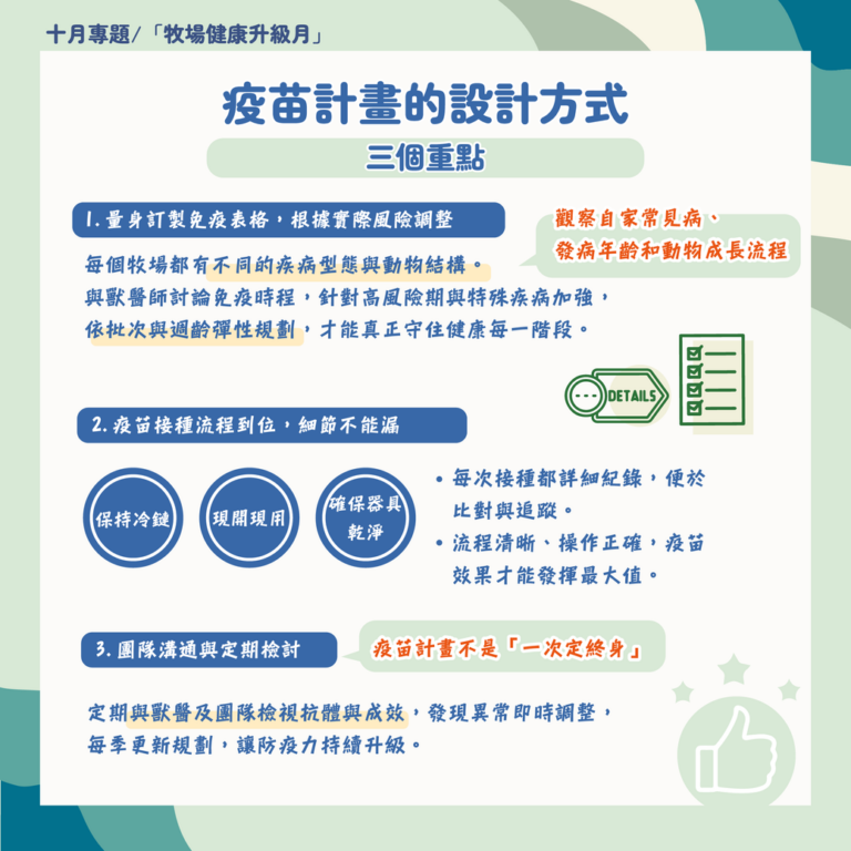 免疫計畫的設計,最關鍵的就是貼近現場。多一份心力、多一點細節,動物自己其實也會回饋穩定成長、健康表現。大家如果有現場遇到的挑戰或新點子,也歡迎隨時分享在交流圈裡!