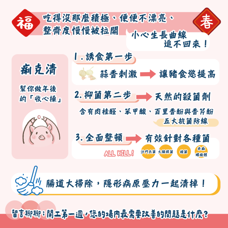 在開工第一週全場使用痢克清 ,就像幫豬場做一次徹底的「腸道大掃除」。把年節累積的隱形病原壓力清掉,便便穩了,採食量回來了,產能自然就回到正軌,全力衝刺生長曲線!