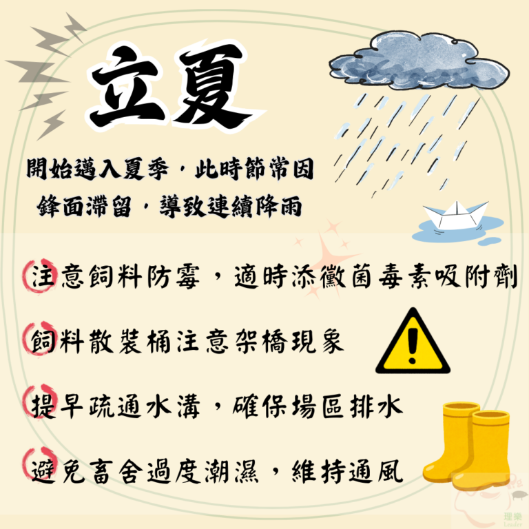 立夏立夏,夏季的開端,此時常因鋒面滯留,帶來連續降雨。適逢梅子成熟,故又稱為梅雨季。此時節需特別留意飼料防霉問題,可適時添加黴菌毒素吸附劑,並注意飼料散裝桶的「架橋」現象,並定期進行空桶清理。所謂架橋,是指粉料在儲存期間,因凝聚作用或附著作用,堵塞管道出口或桶內通道,導致無法順利出料的情況。此外,應提早疏通場區水溝,確保排水順暢,同時降低蚊蟲孳生,並加強畜舍通風,避免環境過度潮濕,維持良好的飼養條件。