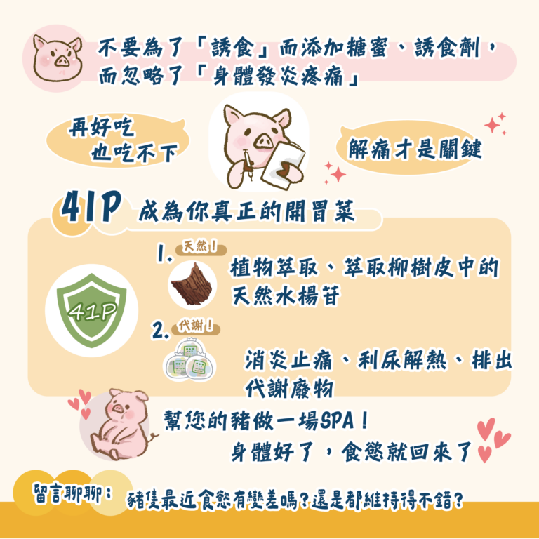 這時候,41P 才是真正的開胃菜。它不只是植物萃取,更含有來自柳樹皮中的天然水楊苷,能溫和消炎止痛,還具有利尿解熱的功能,幫助身體排出代謝廢物。就像幫豬做了一場 SPA,當身體不痛了、發炎退了、體溫降下來了,食慾自然就回來了。這比任何甜頭都有效。