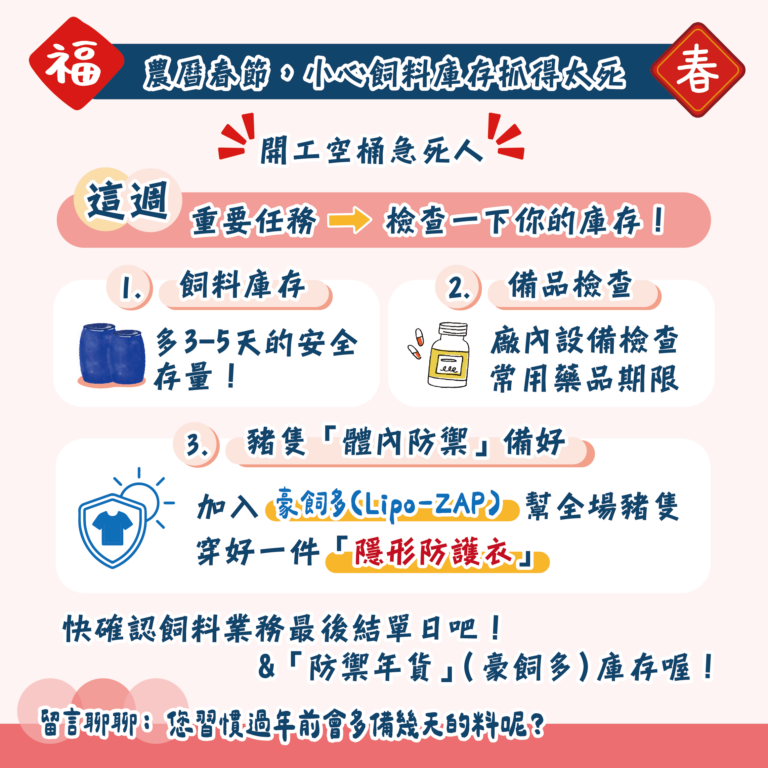 趁著年前這段時間,先幫全場豬隻穿好一件「隱形防護衣」。把體內防禦網架好,就算過年期間人員進出比較雜,我們心裡也有底。