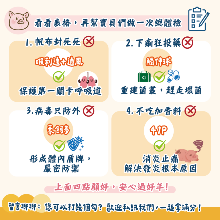 ✅ 解法:喉利通 + 適度通風。記住,呼吸道是第一關,清理氣管、顧好呼吸道,腸道壓力自然小。