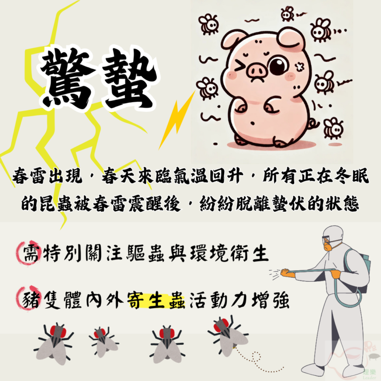 驚蟄驚蟄前後常有春雷出現,春天來臨氣溫回升,所有正在冬眠的昆蟲被春雷震醒後,紛紛脫離蟄伏的狀態,故命名為「驚蟄」。對於養豬場而言,這是一個需要特別關注寄生蟲與環境衛生的時期。氣溫升高後,豬體內外寄生蟲的活動力增強,豬群容易受到鞭蟲、蛔蟲及體外寄生蟲(如疥癬蟲、蒼蠅等)的影響,導致生長遲緩、皮膚病變或營養吸收不良。可以考慮於此時期前後,進行一次全面性的驅蟲,以確保豬隻健康。