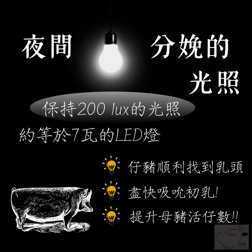Lighting for nighttime delivery At night in the delivery room where the sow is about to give birth, Maintain 200 lux light (approximately equivalent to a 7-watt LED light), Helps piglets find nipples smoothly and suck colostrum as soon as possible. To reduce unnecessary weak piglets and deaths, It has a positive impact on the number of live piglets in sows.